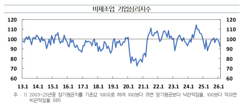 비제조업의 경우 기업심리지수는 92.5로 전월보다 5.4포인트 크게 떨어졌다. 자금사정과 채산성 악화가 주된 요인이다. 그러나 다음 달 전망지수는 97.1로 4.0포인트 상승했다. 업황BSI는 하락했지만 매출 전망은 뚜렷한 반등을 보였고, 자금사정 전망도 개선됐다.