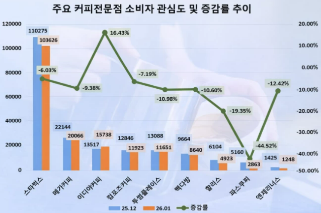 지난달 국내 커피 전문점 가운데 소비자 관심도 1위는 스타벅스가 차지한 것으로 나타났다. 다만 전반적인 관심도는 연말 대비 다소 식은 가운데, 이디야커피만 유일하게 증가세를 보이며 대비되는 흐름을 보였다.