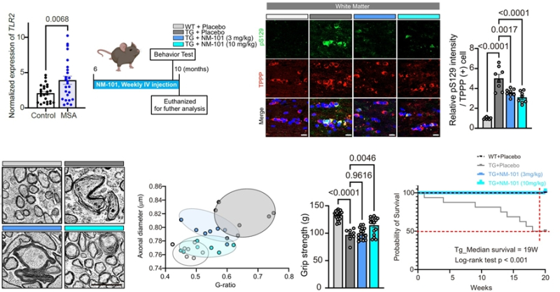 원인을 찾은 연구팀은 세포와 동물 모델에 TLR2 기능을 막는 표적 단일클론항체 'NM-101'을 투여함으로써 항체를 이용해 문을 걸어 잠그자 희소돌기아교세포 안에 알파-시뉴클린 단백질이 쌓이는 현상이 크게 줄었다.