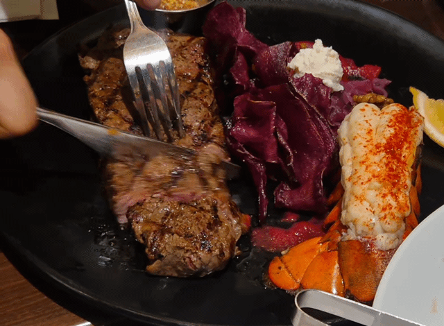랍스터 테일은 한입 먹자마자 탱글탱글한 식감이 느껴졌다. 버터 향이 은은하게 퍼지면서 스테이크와 번갈아 먹기 좋았고, 계속 고기만 먹을 때보다 식사의 흐름이 한층 가벼워지는 느낌이었다. 고기와 해산물을 함께 즐길 수 있어서 연말 모임이나 특별한 날 메뉴로 제격이다.