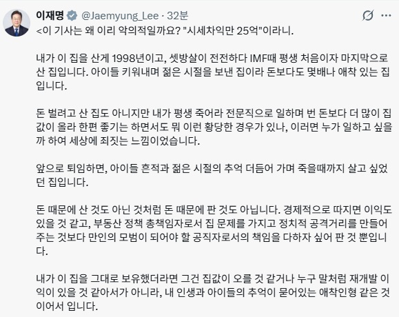 이어 “집값 상승이나 재개발 이익을 기대해 보유하려 했던 것이 아니라 개인적 추억이 담긴 공간이기 때문”이라며 “투기꾼으로 취급하는 것은 과도하다”고 강조했다.