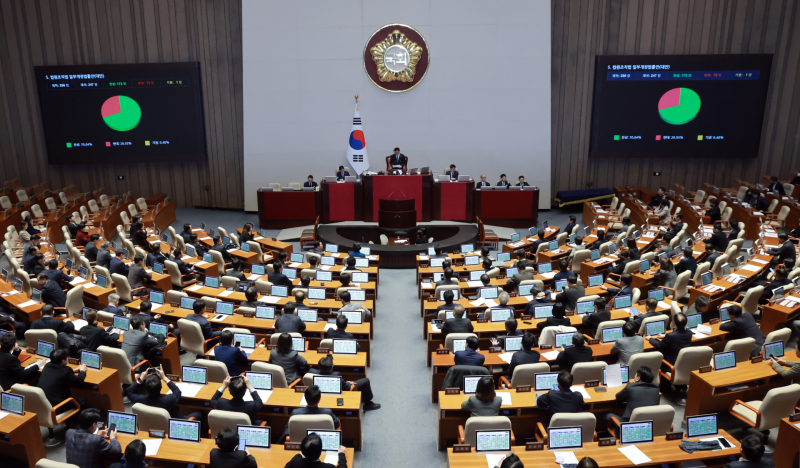 국회는 이날 오후 본회의에서 대법관 정원을 현행 14명에서 26명으로 늘리는 법원조직법 개정안을 재석 247인 중 찬성 173인, 반대 73인, 기권 1인으로 가결했다. 이로써 민주당이 패키지로 추진해온 ‘사법개혁 3법’이 모두 국회 문턱을 넘으며 정부 송부 절차만을 남겨두게 됐다. 앞서 형법 개정안(법왜곡죄 신설)은 26일, 헌법재판소법 개정안(재판소원제 도입)은 27일 각각 통과됐다.
