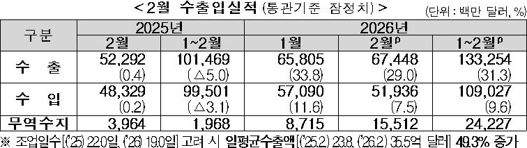 1일 관세청이 발표한 ‘2026년 2월 수출입 현황(잠정치)’에 따르면 지난달 수출액은 674억 4800만 달러로 전년 동기보다 29% 증가했다.