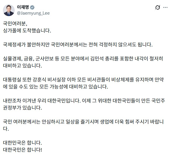 이 대통령은 이날 싱가포르 창이국제공항 도착 직후 엑스(X·옛 트위터)에 글을 올려 “국제 정세가 불안하지만 국민 여러분은 전혀 걱정하지 않으셔도 된다”고 말했다.