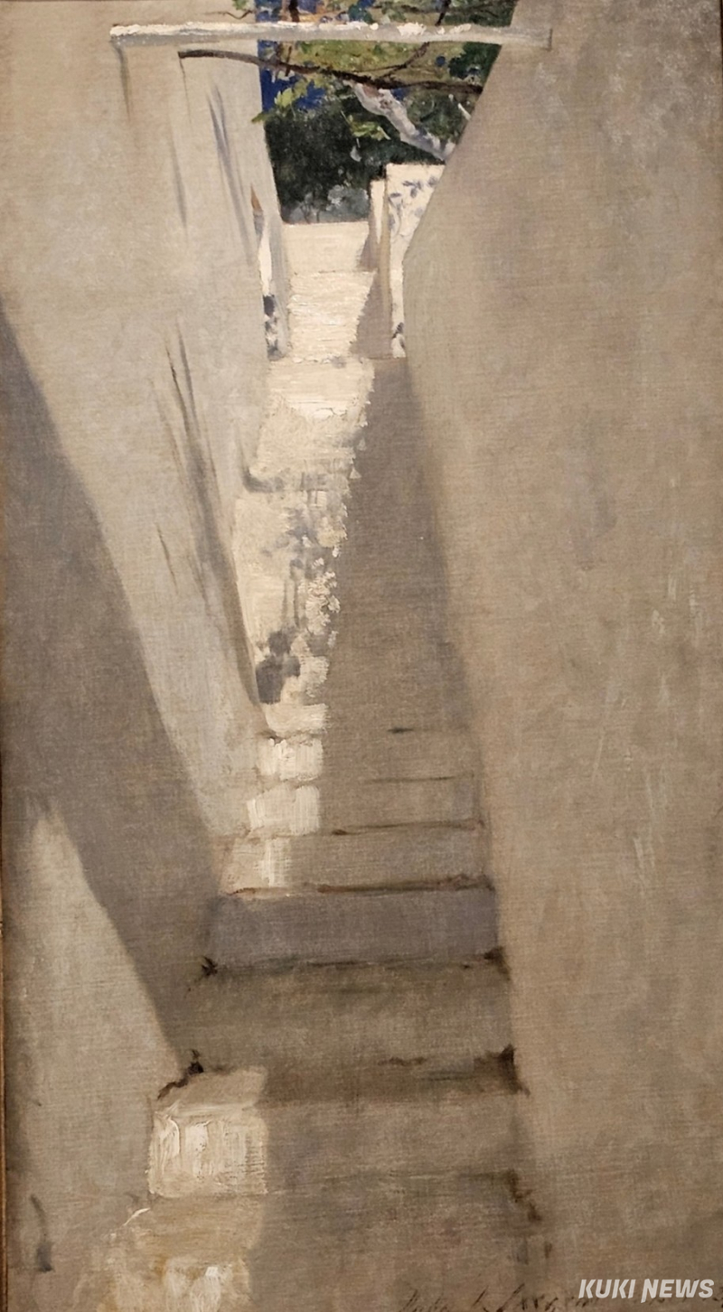 서전트는 1869년, 10대 시절 처음 이 섬을 방문했고, 1878년 다시 돌아왔다. 서전트의 카프리 풍경은 흰색의 단조로움 속에서 빛과 그림자가 만들어내는 무한한 변주를 기록한 것이다. 그는 계단의 기하학적 구조와 그 위를 스치는 빛의 흔적을 통해, 단순한 건축을 시적 풍경으로 승화시켰다.