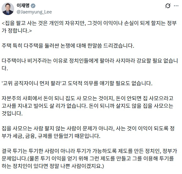 이 대통령은 1일 엑스(X·옛 트위터)에 “집을 사고파는 것은 개인의 자유지만, 그것이 이익이 될지 손실이 될지는 정부가 정한다”며 부동산 시장에 대한 정부 역할을 강조하는 글을 올렸다.