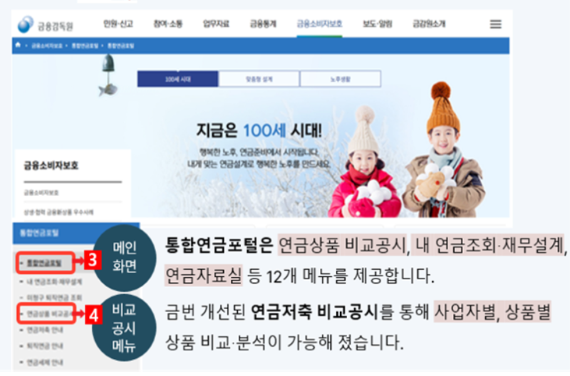 금융감독원은 3일 통합연금포털 내 ‘연금저축 비교공시’ 메뉴를 개편해 지난해 4분기 실적부터 상품별 핵심정보와 유형별 수익률, 판매사별 적립금 현황 등을 단계적으로 제공할 계획이라고 밝혔다. 통합연금포털에서 연금상품 비교공시→연금저축 비교공시로 들어가면 상품별 수익률·수수료율과 판매회사별 적립금 화면을 확인할 수 있다.