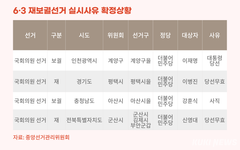 4일 중앙선거관리위원회 ‘재보궐선거 실시사유 확정상황’에 따르면 현재 재보선 확정 지역은 인천 계양을(乙), 경기 평택을, 충남 아산을, 전북 군산·김제·부안갑 4곳이다. 인천 계양을·충남 아산을은 각각 이 대통령과 강훈식 청와대 비서실장의 전 지역구로 재보선을 치른다. 경기 평택을, 전북 군산·김제·부안갑은 공직선거법 위반으로 당선무효형을 확정받은 이병진·신영대 전 민주당 의원의 의원직 상실로 지난 1월 공석이 됐다.