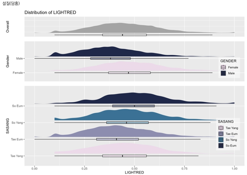 실제 설진 지표 가운데 혀의 색을 정량화한 담홍지수는 성별, 연령, 사상체질에 따라 유의미한 차이를 보였다.