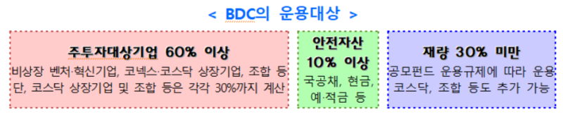 출시를 앞둔 BDC는 비상장 벤처·혁신기업, 투자를 완료한 벤처조합, 시가총액 2000억원 이하 코스닥 상장사 등에 자산의 60% 이상을 투자해야 하며, 이 중 코스닥 소형주·벤처조합 투자는 각각 30%까지만 최소투자비율 산정에 인정된다. 주식·전환사채(CB)·교환사채(EB)·신주인수권부사채(BW) 등 지분성·주식연계증권 투자를 중심으로 하되 금전 대여는 전체 주투자대상기업 투자금액의 40% 이내로 제한하고 내부 신용위험 관리체계를 갖추도록 했다.