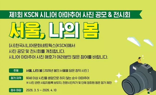 한국시니어문화네트웍스(KSCN)는 ‘제1회 KSCN 시니어 아마추어 사진 공모·전시회’를 개최한다고 5일 전했다.