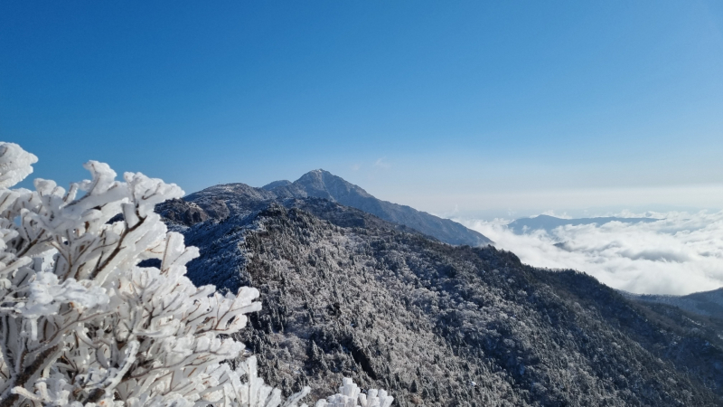 지리산국립공원 촛대봉에서 바라본 봄 설경. 3월 2일 약 7cm의 눈이 내린 가운데 상고대와 운해가 어우러지며 세석평전과 천왕봉 일대가 장관을 이루고 있다.