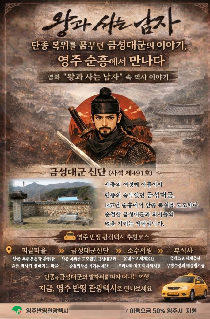 6일 영주시에 따르면 ‘반띵 관광택시’를 이용해 영화 ‘왕과 사는 남자’ 속 역사 이야기를 따라 순흥 일대 주요 관광지를 둘러볼 수 있다.