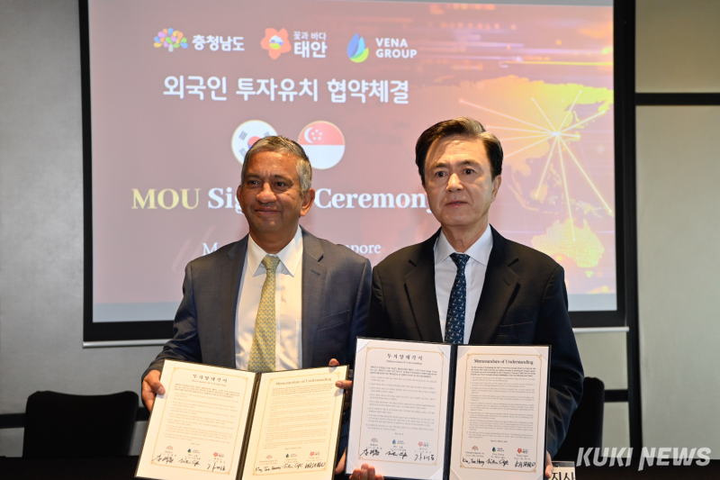 외자유치 개척 등을 위해 싱가포르 출장을 떠난 김태흠 지사는 6일 스위소텔 더 스탬포드 호텔에서 니틴 압테 뷔나그룹 대표, 정광진 뷔나그룹 한국 대표, 가세로 태안군수와 투자 양해각서(MOU)를 체결했다.