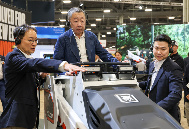 박 회장은 전시장을 둘러보며 AI 기반 생산성 향상과 무인화 기술의 상용화 현황을 집중적으로 살폈다. 특히 건설장비 시장의 AI 기술 현황에 대해 깊은 관심을 나타냈다.