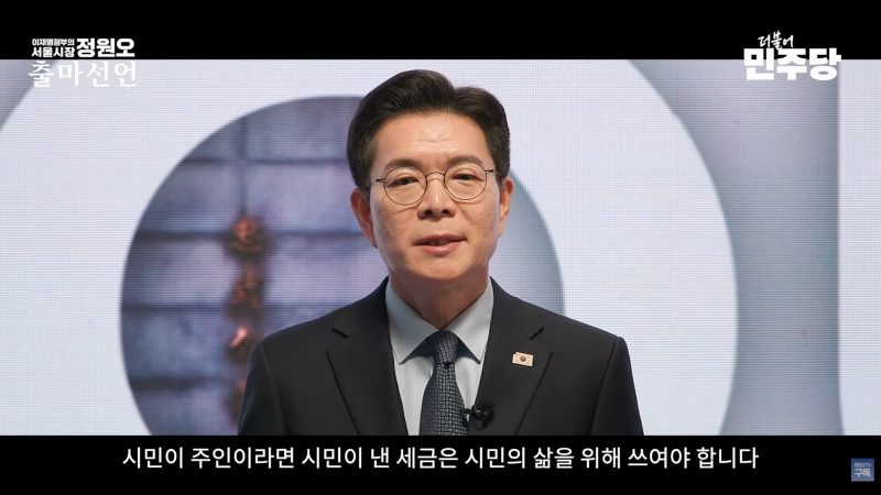 정 후보는 9일 오전 10시 유튜브 채널 ‘정원오TV’에 올린 영상을 통해 “이재명 대통령을 뒷받침할 서울시장이 필요하다”며 출마 선언을 했다. 그는 “국민 주권 정부와 정원오의 ‘시민 주권 서울’이 위기를 기회로 만들 것”이라며 “정부의 성공을 함께 만들어갈 서울시장 후보가 바로 정원오”라고 강조했다.