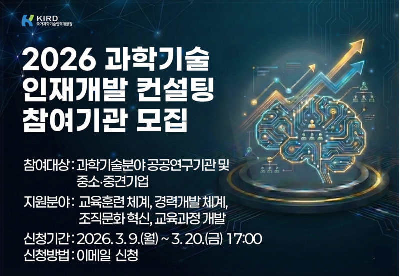 국가과학기술인력개발원(KIRD)이 과학기술 분야 공공연구기관과 중소·중견기업의 인재개발 체계 선진화 방안을 제시하는 ‘2026년 과학기술 인재개발 컨설팅 지원 사업’을 본격 추진한다.