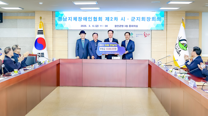 함안군은 지난 6일 함안지체장애인 후원회(회장 나희욱)가 함안군청 별관 회의실에서 (사)경남지체장애인연합회 함안군지회(회장 이성형)에 차량 구입을 위한 후원금 2000만원을 전달했다고 밝혔다.