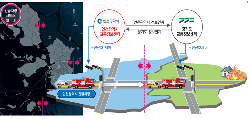 인천은 지역 특성상 강화도와 영흥도 등 일부 지역으로 이동할 때 경기도 지역을 경유해야 하는 경우가 많아 긴급환자 이송이나 재난 대응 시 교통신호 연계가 어려운 상황이 발생해 왔다.