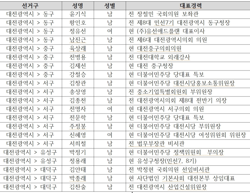 이어 동구청장 선거에 윤기식, 황인호, 정유선, 남진근 등 4명, 중구청장 선거에 육상래, 전병용, 김제선, 강철승 등 4명, 대덕구청장 선거에 김안태, 박종래, 김찬술 등 3명, 유성구청장 선거에 박정기, 정용래 등 2명이 가각 신청했다.