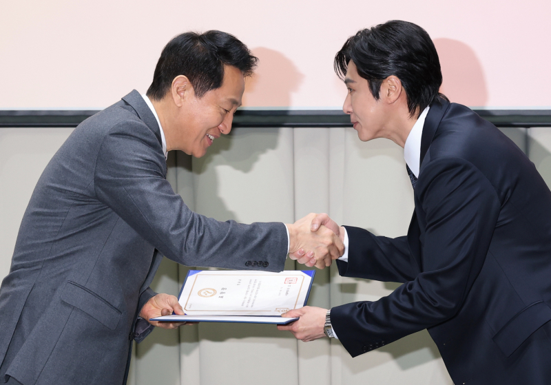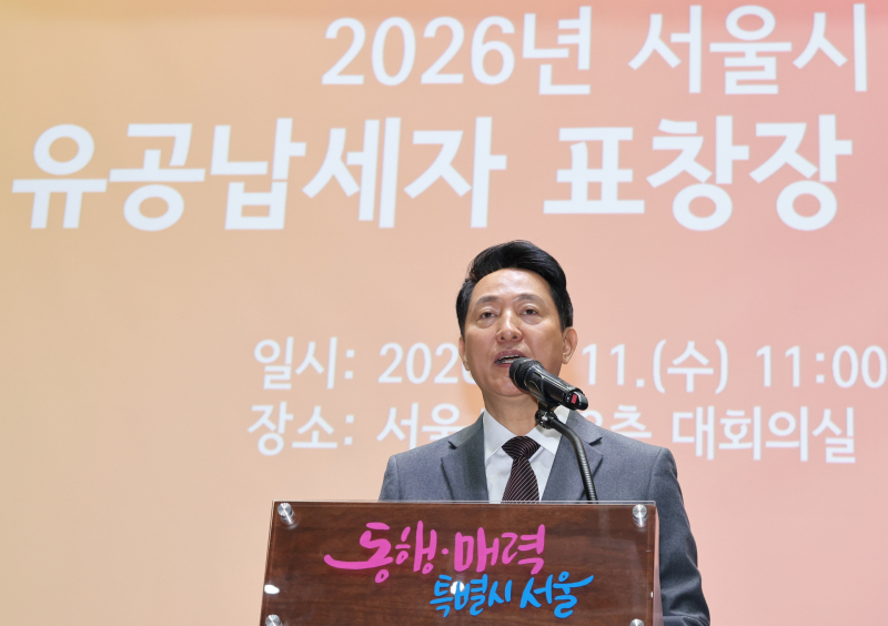오세훈 서울시장이 11일 서울시청에서 열린 ‘2026년 서울시 유공납세자 표창장 수여식’에서 인사말을 하고 있다. 가수 유노윤호(정윤호)가 11일 서울시청에서 열린 ‘2026년 서울시 유공납세자 표창장 수여식’에서 오세훈 서울시장에게 표창장을 수여받고 있다.