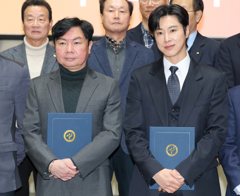 배우 임원희(왼쪽)와 가수 유노윤호(정윤호)가 11일 서울시청에서 열린 ‘2026년 서울시 유공납세자 표창장 수여식’에서 표창장을 들고 기념촬영을 하고 있다.