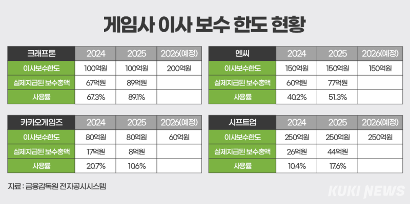 한편 크래프톤이 보수 한도를 늘린 것과 달리 게임사별 보수 정책은 엇갈리고 있다. 엔씨소프트는 2024년 이사 보수 한도를 기존보다 50억원 줄인 150억원으로 설정한 이후 현재까지 동일한 수준을 유지하고 있다. 지난해 실제 지급된 보수 총액은 약 77억원이다.