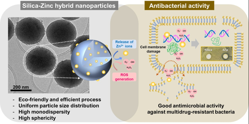 분석 결과 아연-실리카 나노물질에서는 아연 이온(Zn²⁺) 방출과 광촉매 반응에 따른 활성산소종(ROS) 생성이 동시에 일어나는 이중 항균 메커니즘이 확인됐다.