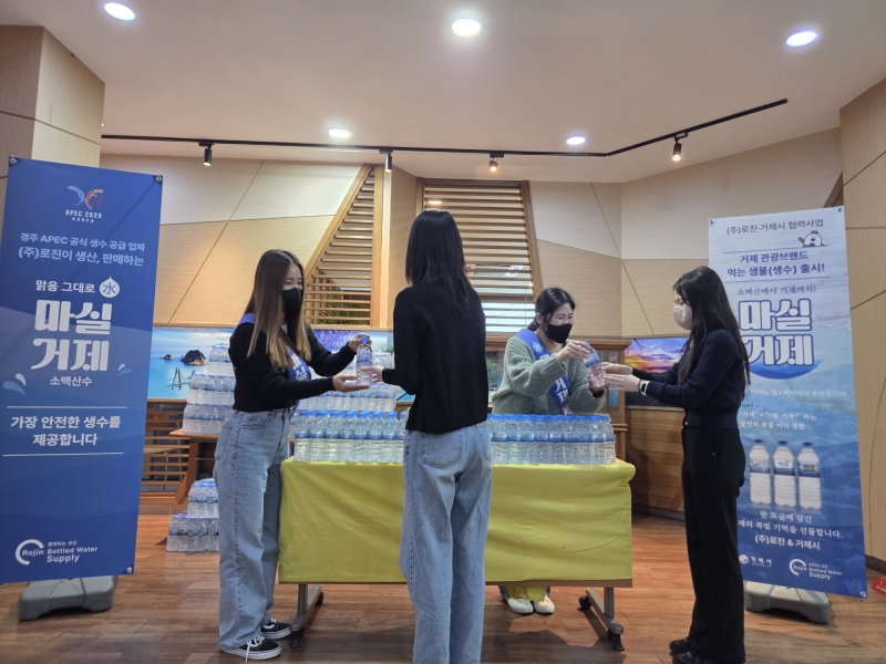 이날 제조사인 ㈜로진 관계자들이 직접 시음 행사를 열어 제품의 특성과 최고 등급 미네랄 함량을 설명했다. ㈜로진은 ‘2025 APEC 정상회의’ 공식 생수 공급 업체로 공신력이 있다.