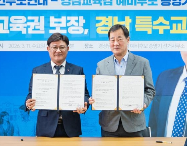 송영기 후보는 특수교육 강화와 장애학생 교육권 보장을 핵심 정책으로 제시했다. 그는 경상남도장애인부모연대와 정책협약을 체결하고 △행동중재 전담부서 설치 △장애학생·비장애학생 통합교육 확대 △진로·직업교육 강화 △초등 장애학생 돌봄 지원 확대 △특수교육 분쟁조정위원회 설치 △학부모 지원체계 구축 △근거리 학교 배정 의무화 등을 추진하겠다고 밝혔다.
