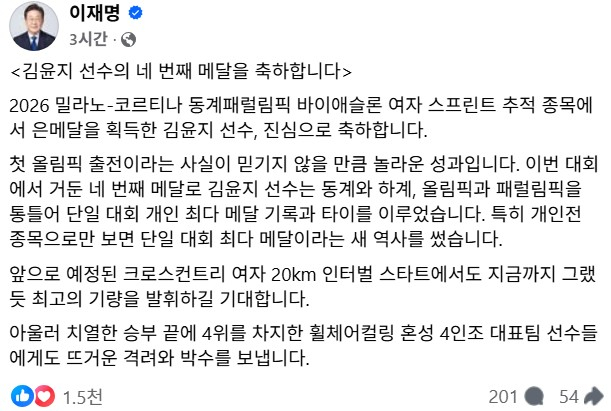 이 대통령은 이날 자신의 페이스북과 소셜미디어(SNS)를 통해 “김윤지 선수의 네 번째 메달을 축하한다”며 “첫 올림픽 출전이라는 사실이 믿기지 않을 만큼 놀라운 성과”라고 밝혔다.