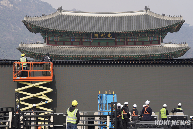 서울 종로구 광화문광장이 방탄소년단(BTS)의 컴백 공연을 앞두고 분주하게 움직이고 있다. 16일 광화문광장에는 공연을 위한 대형 무대 설치와 안전 펜스 작업이 진행되며 공연 준비가 본격화됐다.