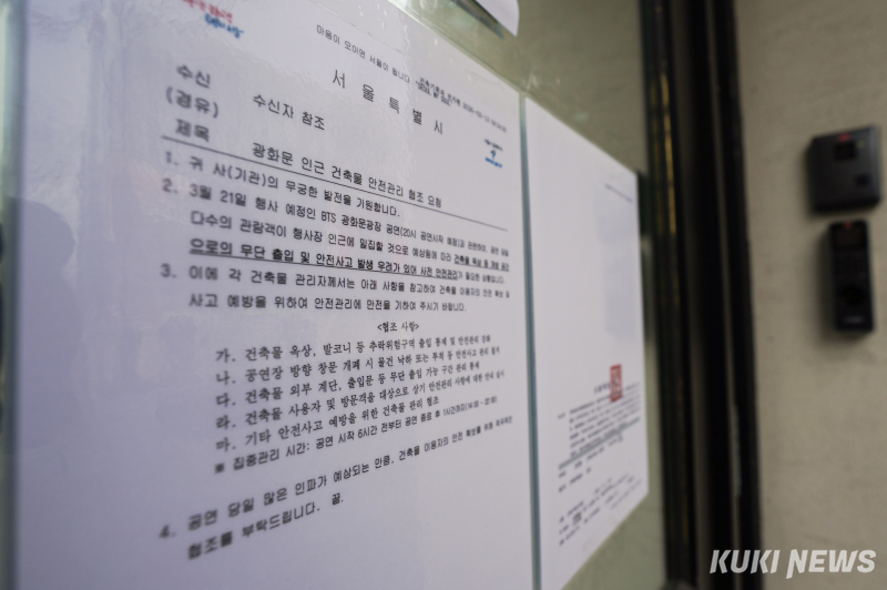 21일 열리는 ‘BTS 컴백 라이브 : ARIRANG’은 BTS가 약 4년 만에 완전체로 선보이는 무대다. 광화문광장을 중심으로 세종대로에서 시청역 인근까지 약 1km 구간을 관람 공간으로 활용하는 대규모 행사로 진행될 예정이다.대규모 인파가 몰릴 것으로 예상되면서 서울시와 경찰도 대비에 나섰다. 공연 당일 최대 26만 명이 광화문 일대에 모일 것으로 전망되는 가운데 경찰은 약 4천 명 이상의 경력을 투입해 안전 관리에 나설 계획이다. 한편 서울시는 출입구를 제한해 관람객을 통제하고, 주변 건물 옥상 출입을 막는 등 사고 예방을 위해 조치하고 있다.