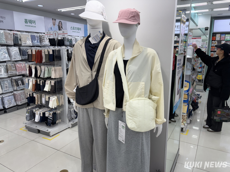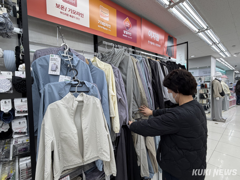 매장 풍경도 달라졌다. 매장 관계자는 “옷 진열하는 면적이 지난해보다 확실히 늘었다”며 “옷 코너가 차지하는 공간이 눈에 띄게 커졌다”고 전했다. 실제로 이날 매장에서는 입구 가까운 주요 자리에 의류 행거가 배치돼 있었고, 바람막이·티셔츠·가디건 등이 색상별로 진열된 코너에는 손님들의 발길이 끊이지 않았다. 계산대 앞에는 의류를 포함한 장바구니를 든 고객 비율이 눈에 띄게 높았다.
