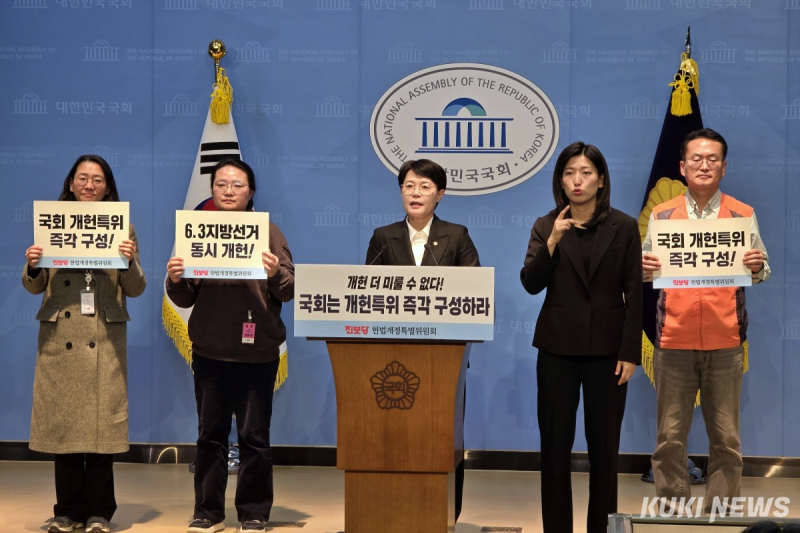 이에 범여권은 여야에 빠른 개헌특위 구성을 촉구하며 목소리를 높였다. 전종덕 진보당 의원은 이날 서울 여의도 국회 소통관에서 시민단체 대표들과 기자회견을 열고 “남은 것은 오직 국회의 결단뿐”이라면서도 “하지만 거대 정당은 어떻느냐, 국민의 삶은 안중에도 없고 여전히 정치적 유불리만 따지며 낡은 셈법에 갇혀 있다”고 비판했다.