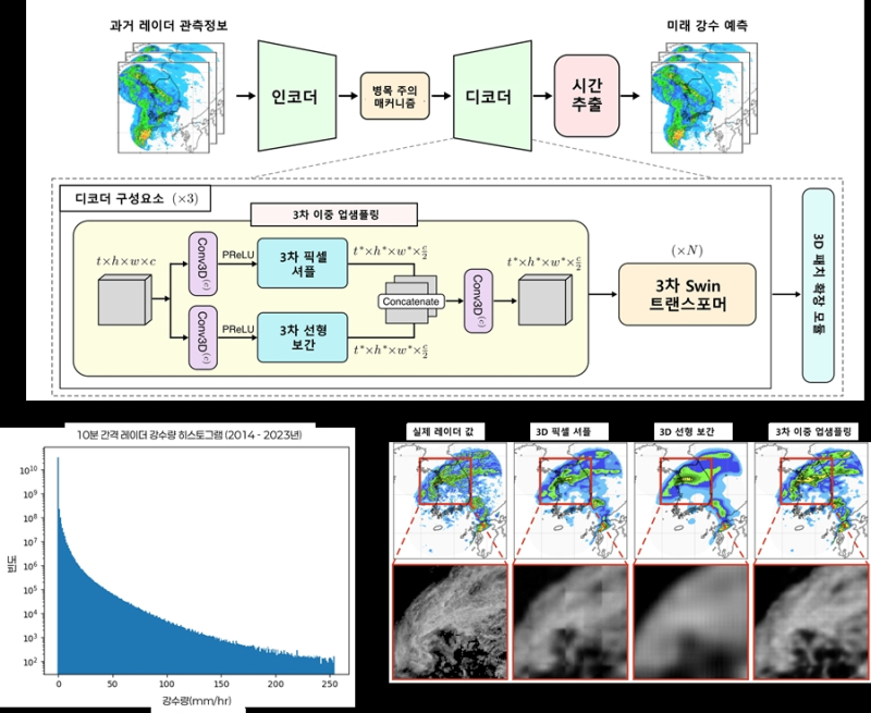 기존 방식은 해상도를 높이는 과정에서 세부 정보가 손실되기 쉬웠지만, 이 모델은 3차 이중 업샘플링 방식으로 미세한 강수 형태까지 살필 수 있다.