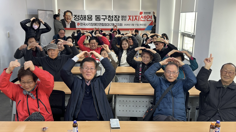한국시각장애인연합회 대구동구지회는 17일 지회 사무실에서 임원과 회원들이 참석한 가운데 지지 선언식을 열고, 정 예비후보를 “동구의 복잡한 현안을 풀 행정력과 소외된 이웃의 목소리를 경청해 온 낮은 자세를 갖춘 인물”이라고 평가하며 공식 지지를 밝혔다.