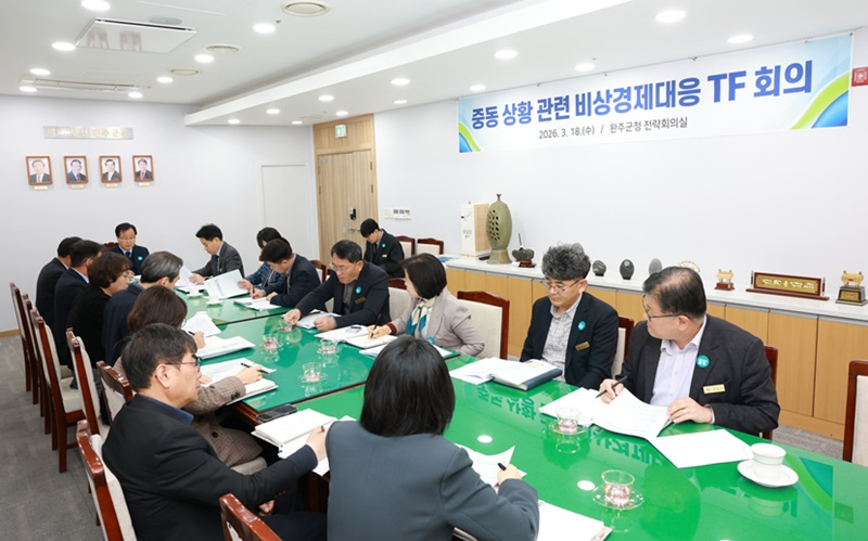 전북 완주군이 중동 전쟁 발발에 따른 국제유가 상승과 원자재 수급 불안 등 글로벌 경제 위기 대응을 위해 18일 오전 군청 전략회의실에서 ‘중동 상황 관련 비상경제 대응 TF 회의’를 열고 지역 경제 영향 최소화 방안을 집중 논의했다.