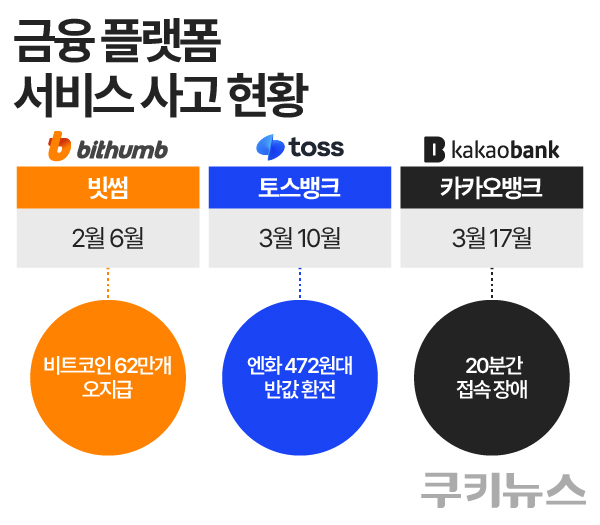 이보다 앞선 10일에는 토스뱅크에서 이른바 ‘엔화 반값 환전’ 사고가 났다. 이번 오류는 환율 정보를 종합해 고시환율을 산출하는 내부 시스템이 일시적으로 오작동하면서 발생했다. 해당 시간 엔화는 100엔당 472원대 환율로 표시됐다. 전날 엔화 환율 종가인 932.86원의 절반 수준이다. 오류가 지속된 약 7분 동안 약 284억원 규모의 엔화 환전이 이뤄진 것으로 추산된다. 토스뱅크는 사고 다음 날 해당 거래를 취소시켜 ‘반값 엔화’를 회수했다.
