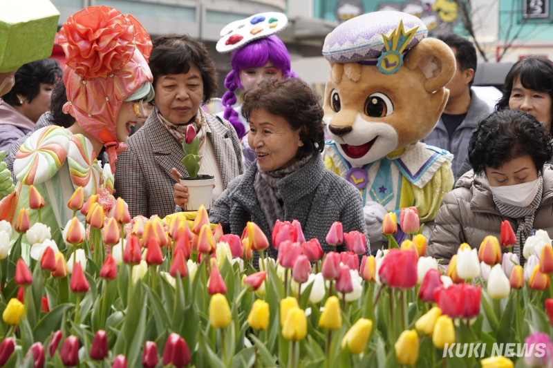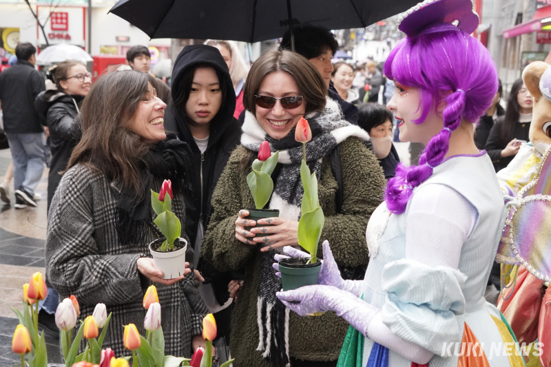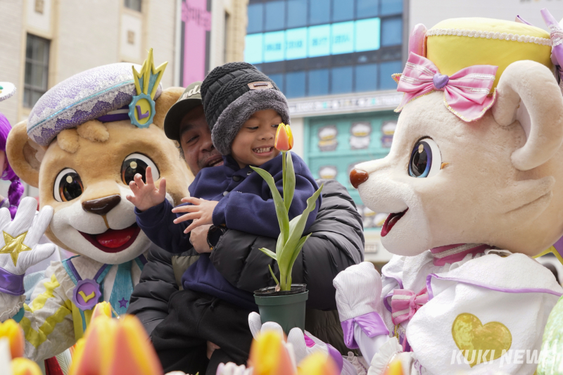 18일 서울 중구 에잇세컨즈 명동점 앞에서 레니·라라 캐릭터 분장을 한 모델들이 시민 120명에게 튤립 화분을 전달하며 율동과 퍼레이드로 깜짝 공연을 선보였다.