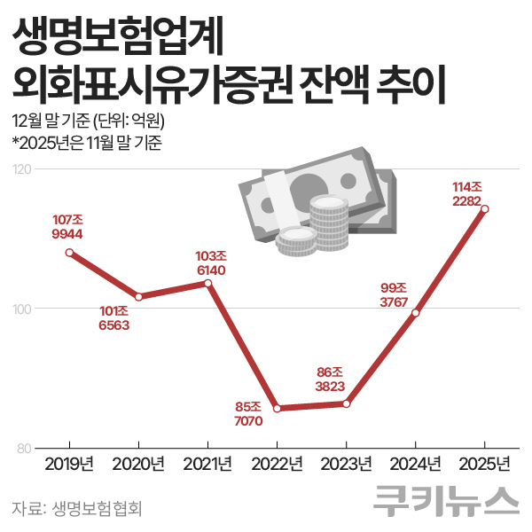 외화유가증권 규모는 IFRS17 도입 이후 증가 흐름이 뚜렷하다. 2019년 107조9944억원에서 2020년 101조6563억원, 2021년 103조6140억원, 2022년 85조7070억원으로 감소했다가, 2023년 86조3823억원, 2024년 99조3767억원, 2025년 114조2282억원으로 다시 확대됐다.