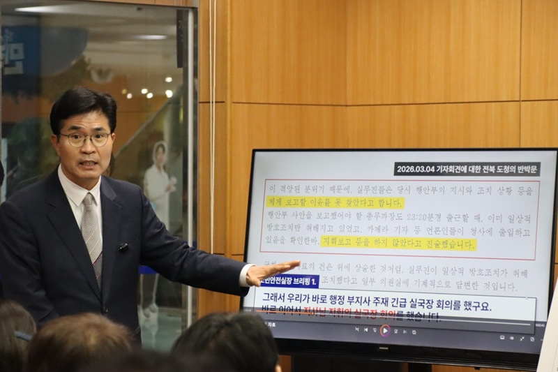그러면서“김 지사가 지휘한 행위를 ‘실무자의 실수’나 ‘기계적 대응’으로 포장하고, 청사 출입 통제를 ‘통상적 방호’라고 속인 것은 책임 회피에 그치는 게 아니라 선거에 당선될 목적으로 유권자를 속인 명백한 공직선거법상 허위사실 공표에 해당될 수 있다”고 경고했다.