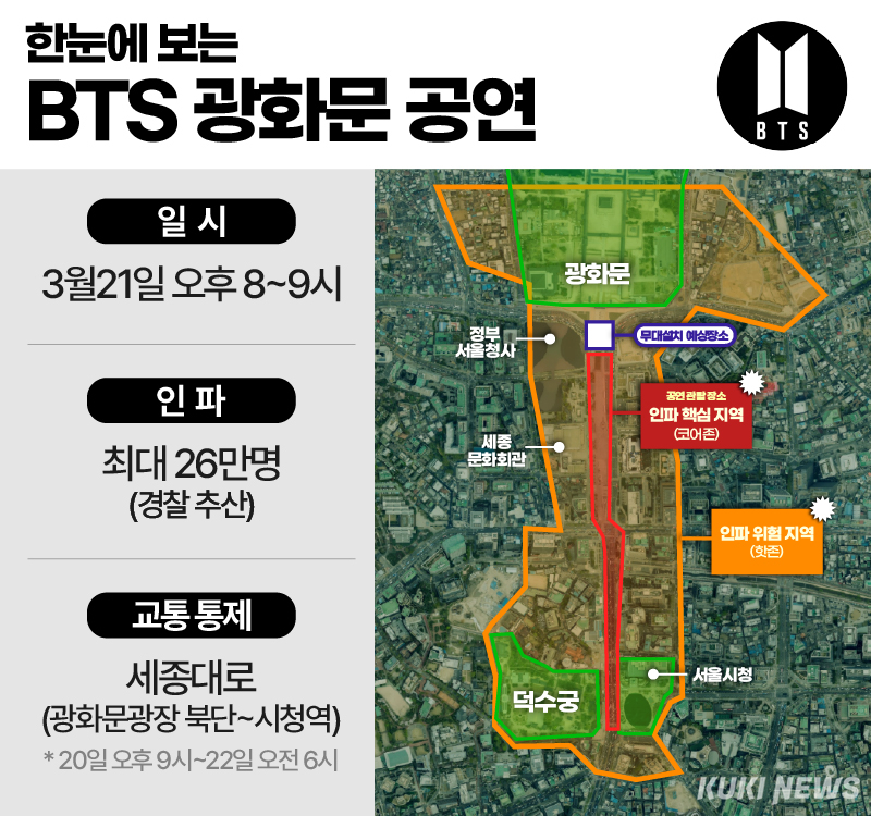 서울 광화문 일대에서 열리는 방탄소년단(BTS)의 완전체 컴백 공연이 목전으로 다가왔다. 행사 당일 최대 26만명의 인파가 몰릴 것으로 전망되는 가운데, 정부·지자체 모두 안전 관리에 총력을 기울이고 있다. 서울광장 등 행사장 곳곳에서 실시간 중계가 이뤄지는 ‘오픈형 무대’인 만큼 도심 한복판이 하나의 공연장으로 탈바꿈하는 모습이다.