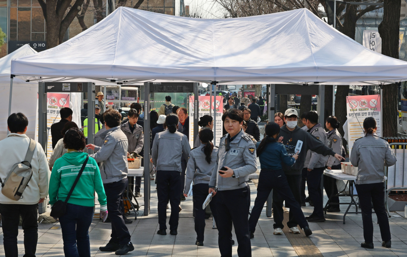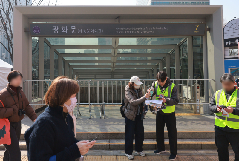 공연을 하루 앞둔 지난 20일 오후부터 광화문 일대는 이미 인파로 붐비기 시작했다. 무대 주변에는 철제 펜스가 촘촘히 설치됐고, 금일 관람객과 통행객 모두 금속탐지기를 포함한 검문을 거쳐야 이동이 가능하다. 역 출구를 나온 뒤에도 문형 금속탐지기(MD)를 통과해야 하며, 가방 내부까지 확인하는 검색이 진행된다. 스태프 역시 예외 없이 동일한 절차를 밟는다.