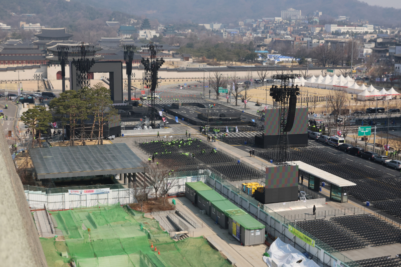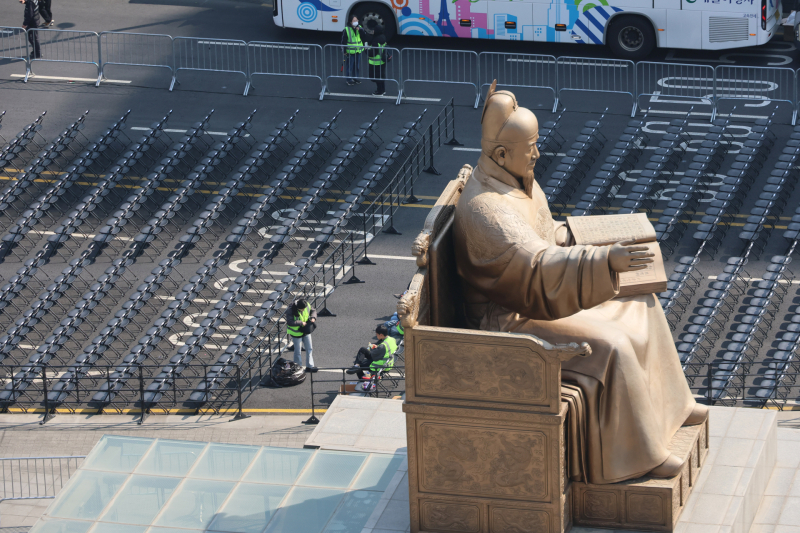 BTS 컴백 공연 당일인 21일 서울 광화문광장 공연장에 팬들을 위한 좌석이 가지런히 설치돼 있다.