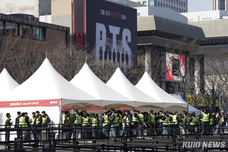 이날 광화문 일대는 전례 없는 대형 공연장으로 변모했다. 도로 통제를 위한 철제 펜스가 공연장 주위를 에워쌌고, 걸음마다 경찰을 비롯한 각 부처에서 나온 인력이 배치돼 있었다. 인근 지하철 역사에선 경찰 및 스태프가 좁은 간격으로 서서 제한적으로 개방된 출입구를 쉬지 않고 안내했다.