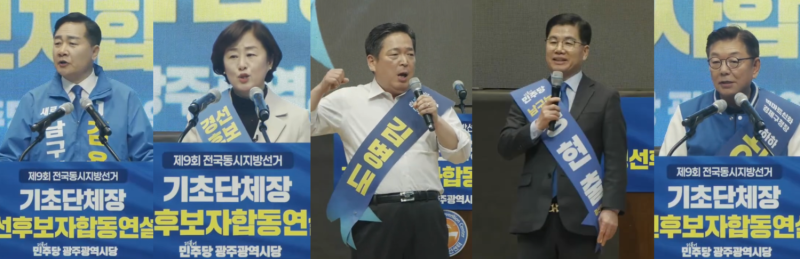 21일 광주 김대중컨벤션센터에서 열린 더불민주당 광주시당 기초단체장 경선 후보자 합동연설회에서 김용집·하상용·황경아·성현출·김병내 예비후보는 남구의 인구 감소와 상권 침체 해법을 두고 격렬한 토론을 벌였다.
