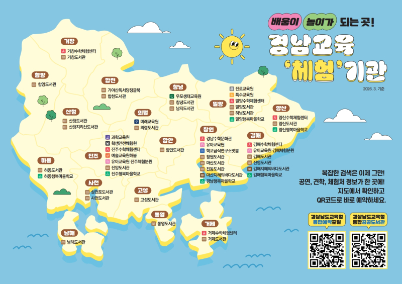 경상남도교육청은 도내 직속기관을 중심으로 수학·과학·생태·안전·진로 분야 체험 프로그램을 상시 운영하고 52개 기관 정보를 담은 ‘체험 지도’와 QR 기반 예약 서비스를 함께 제공한다.