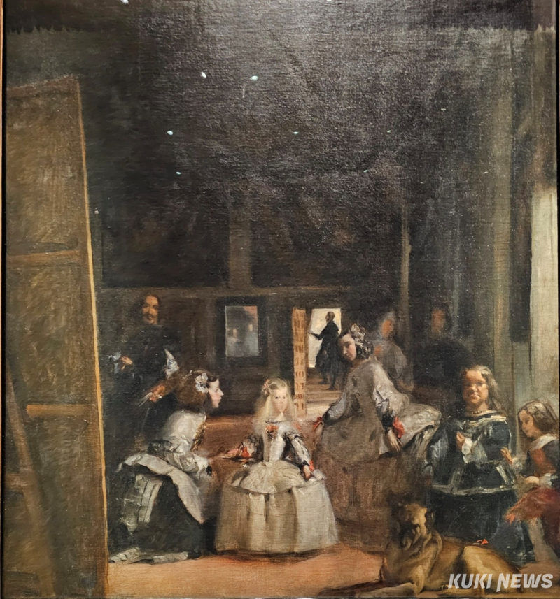 이 그림은 공간과 시선의 퍼즐로 유명하다. 어두운 방 안에서 사랑스러운 마르가리타 테레사가 시녀들, 난쟁이들과 함께 서 있고, 뒤편에는 역광 속에 인물이 들어오거나 나가는 듯한 장면이 있다. 거울에는 펠리페 4세와 왕비의 모습이 비치는데, 이들이 모델인지, 혹은 단순한 등장인물인지 해석이 분분하다. 왼쪽에는 커다란 캔버스 앞에 서 있는 벨라스케스 자신이 등장해, 그림 속 그림을 그리는 듯한 복잡한 구조를 만들어낸다.