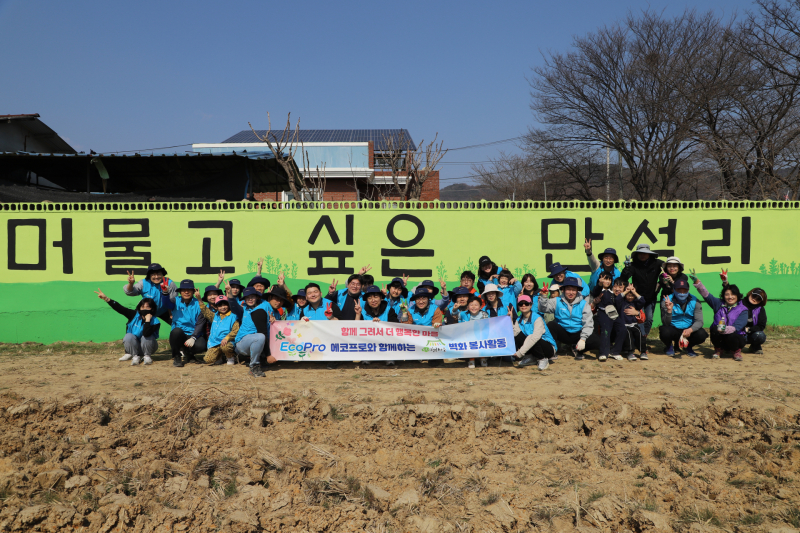 에코프로 봉사단은 사랑그리다 벽화봉사단과 함께 미나리·사과·고구마 등 마을 특산물을 벽화에 담아 분위기를 한층 밝게 만들었다.